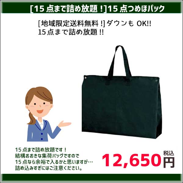 また、ダウン衣料もご利用になれますが、このパックではお届け時の梱包の関係上、ダウン点数の上限を7点までとさせていただきます。 上限数を超えた分につきましては、1点当り770円(税込)が別途ご請求となります。